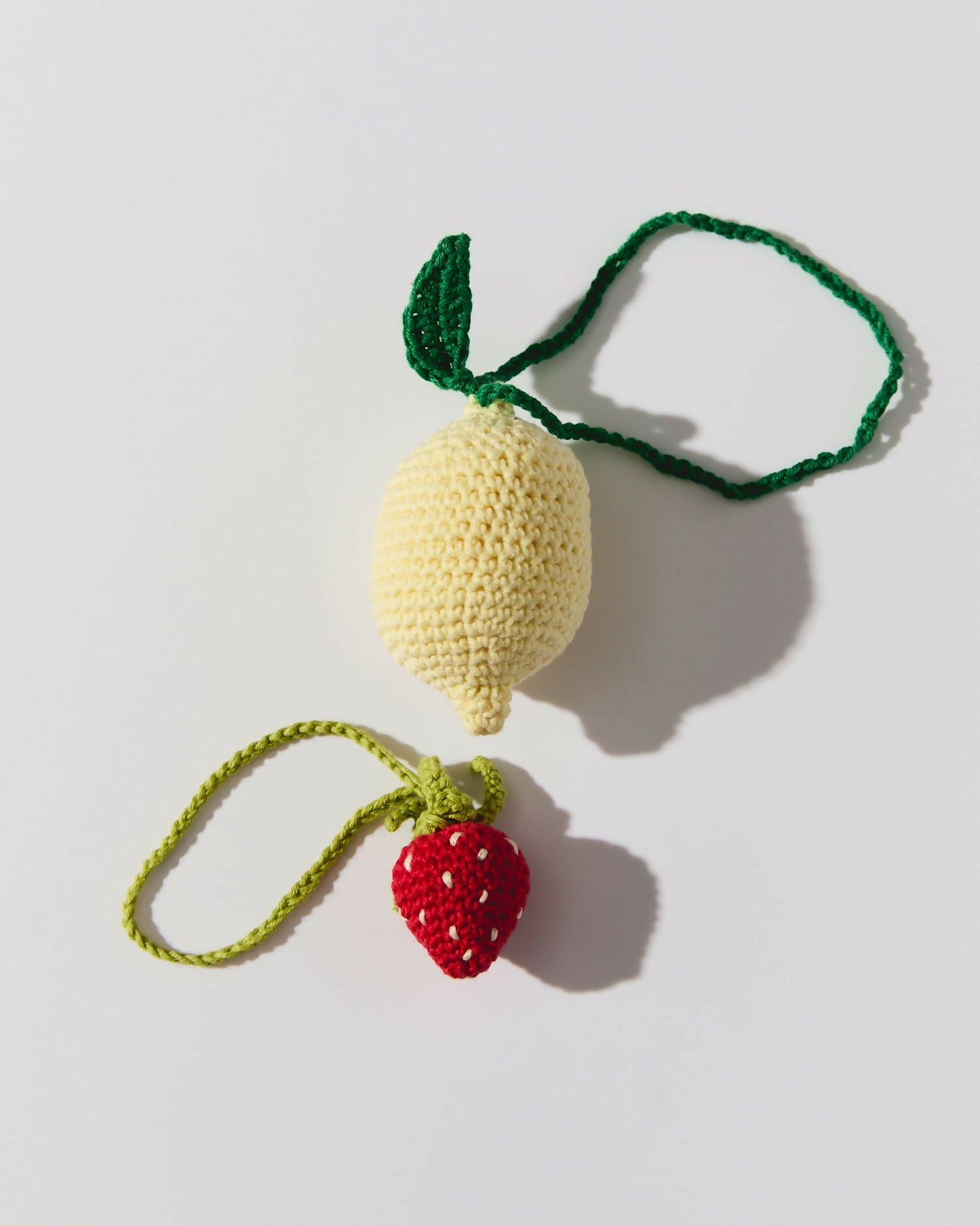 Czerwony szydełkowy breloczek w kształcie truskawki z białymi kropkami i zieloną szypułką oraz sznureczkiem. Do breloczka dołączone jest srebrne kółeczko do zawieszenia. W środku hipoalergiczne poliestrowe wypełnienie.