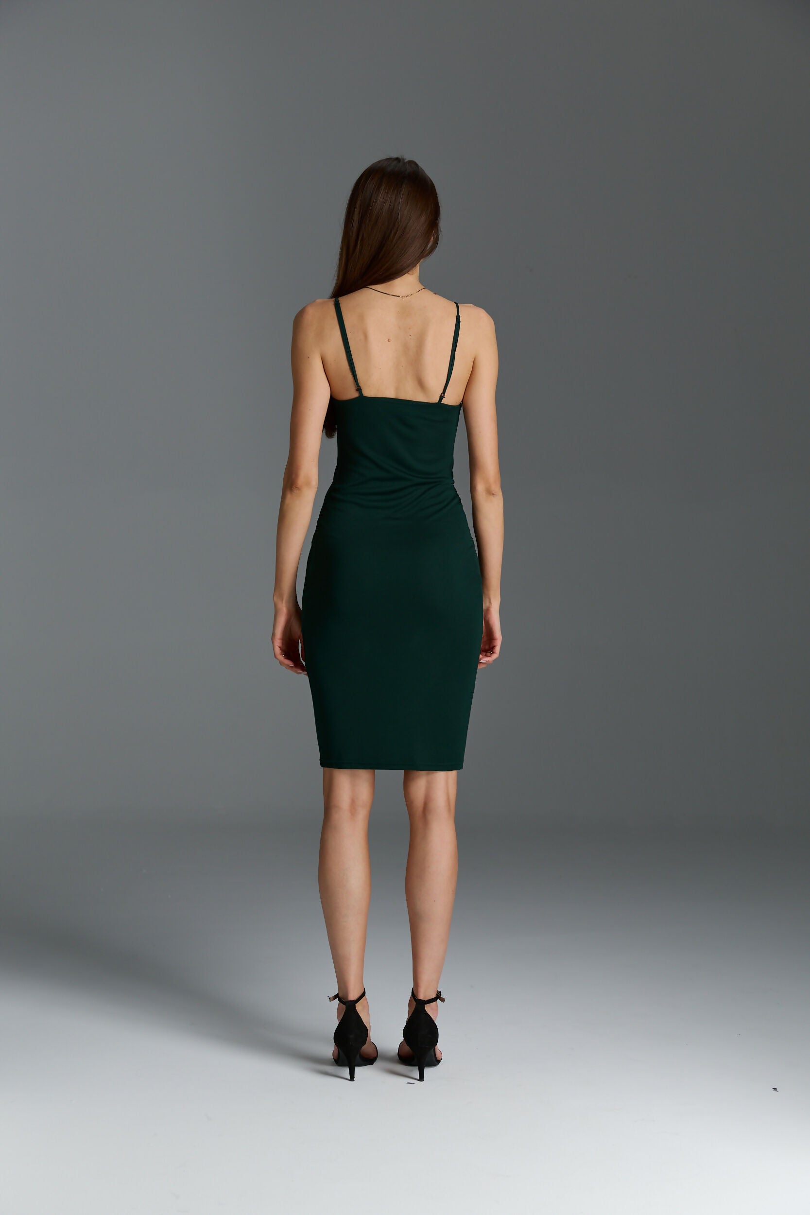 Dół sukienki jest delikatnie zwężany i nie posiada rozcięcia.