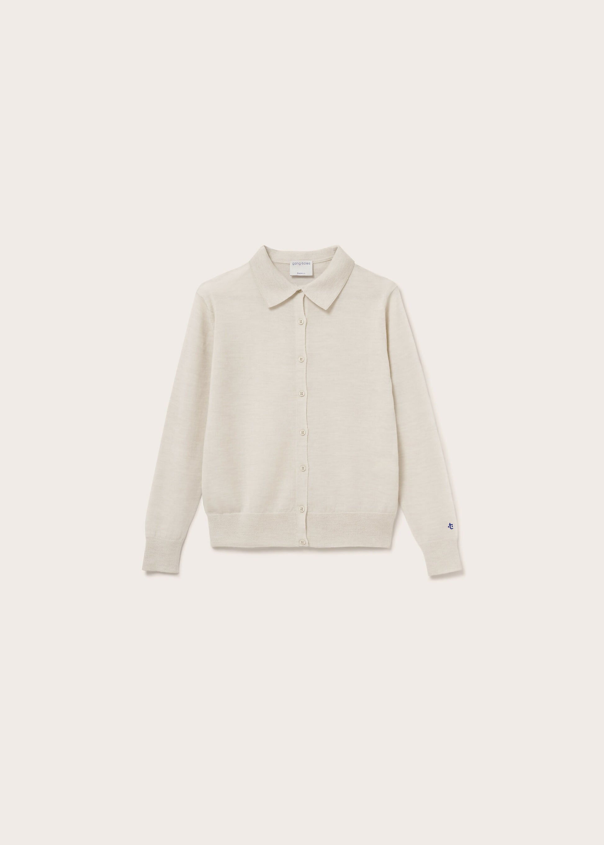 Lekki, cienki kardigan polo z kołnierzykiem. Zapinany na grawerowane guziki. Charakterystyczny, subtelny ścieg na plecach. Swobodny, nieopinający krój. Haftowany kobaltowy logotyp nad lewym mankietem. Wykonany z najwyższej jakości przędzy z merynosa.