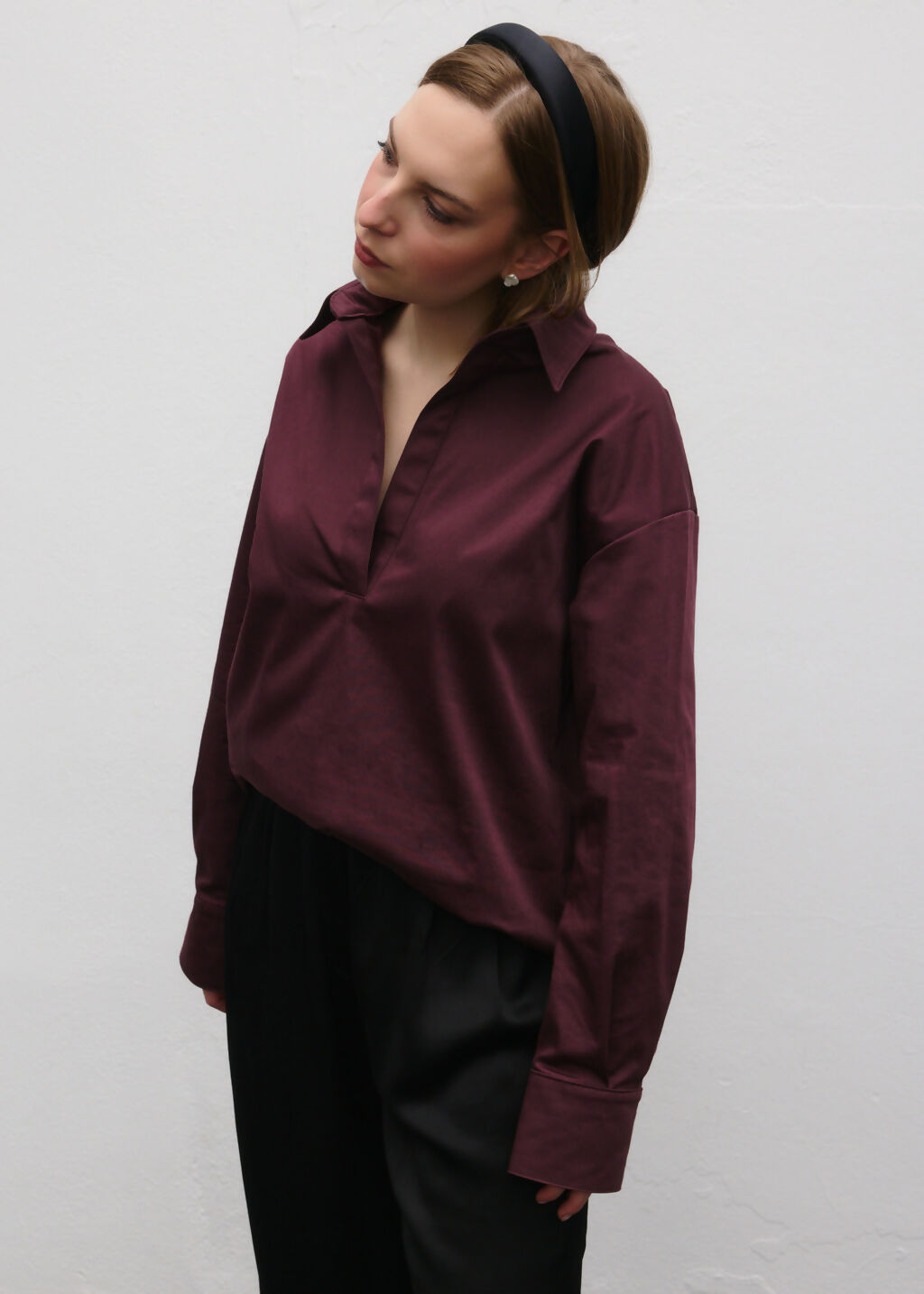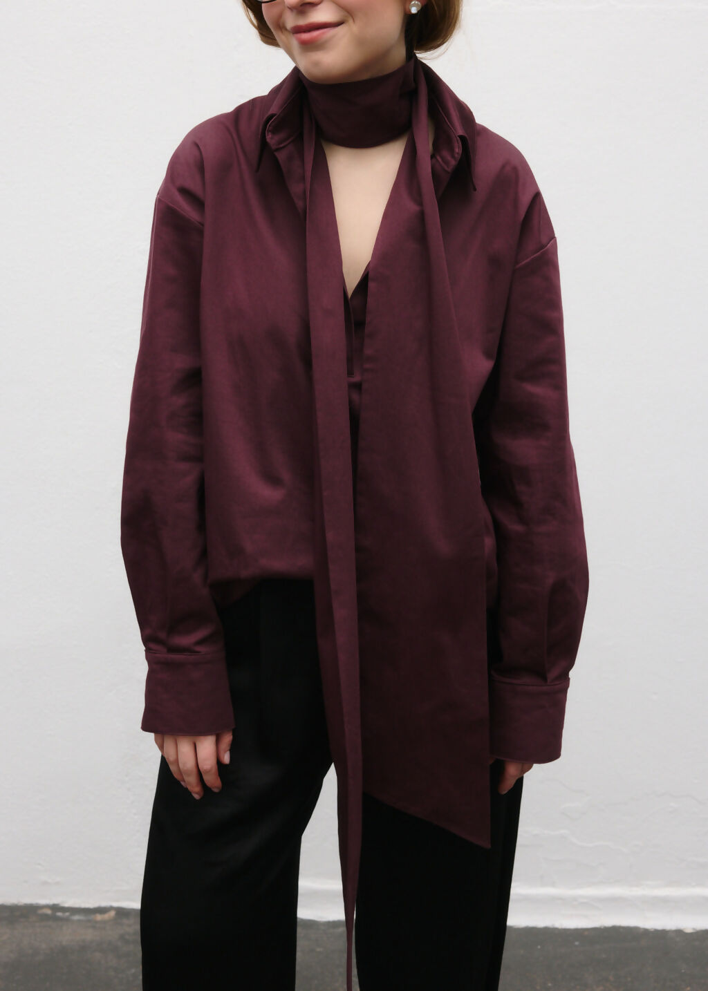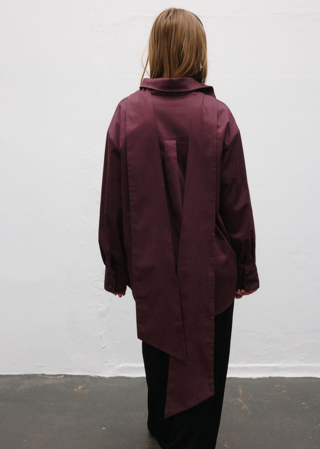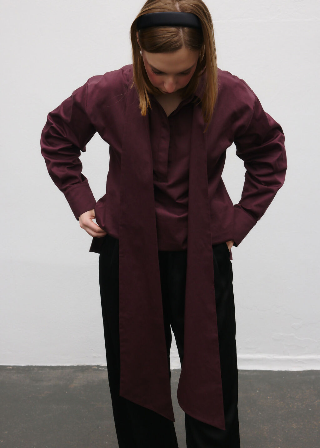 Luźny, oversize’owy krój o wydłużonej linii. Klasyczny kołnierz koszulowy. Długie rękawy zakończone mankietami zapinanymi na guziki. Ozdobne wiązanie przy dekolcie. Wiązanie przy szyi daje możliwość stylizacji na wiele sposobów – można je nosić luźno opuszczone, zawiązane w delikatną kokardę lub bardziej wyrazisty węzeł, dopasowując wygląd do okazji i własnego stylu.