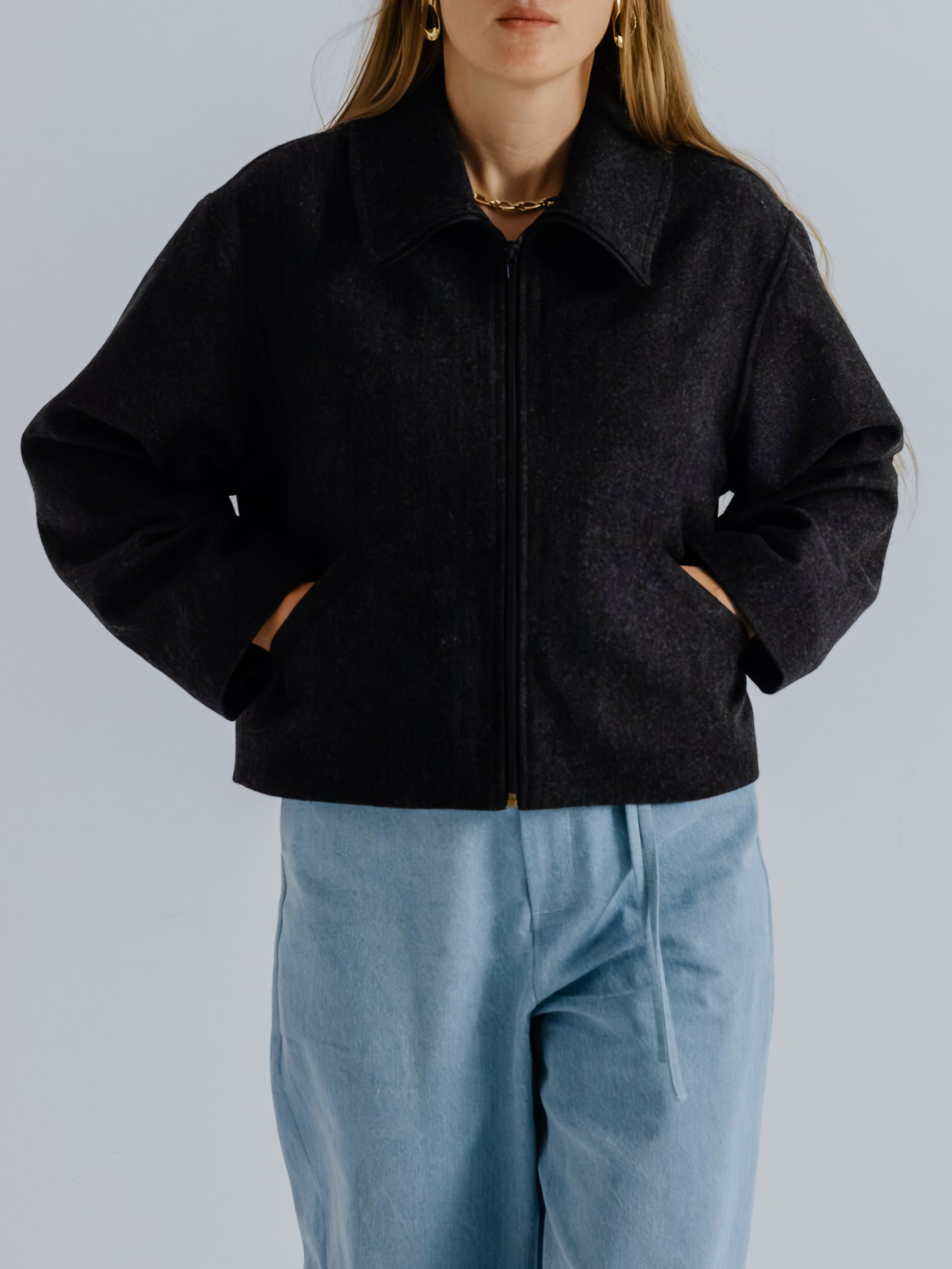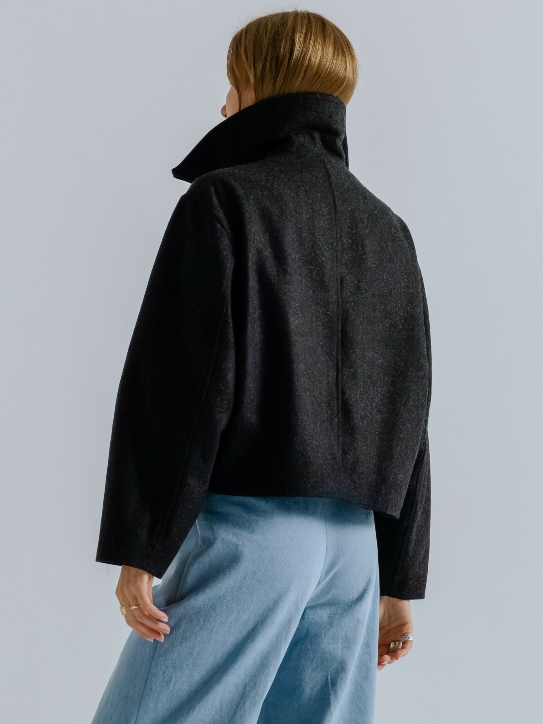 Krótka kurtka o pudełkowym, oversizowym kroju, wykonana z wysokiej jakości mieszanki wełny i wiskozy w ciemno szarym kolorze, wpadający w antracyt z nutką melanżu. Wyposażona w zamek błyskawiczny z wysoką stójką, która po rozpięciu zmienia się w miękko układający się, obszerny kołnierz.