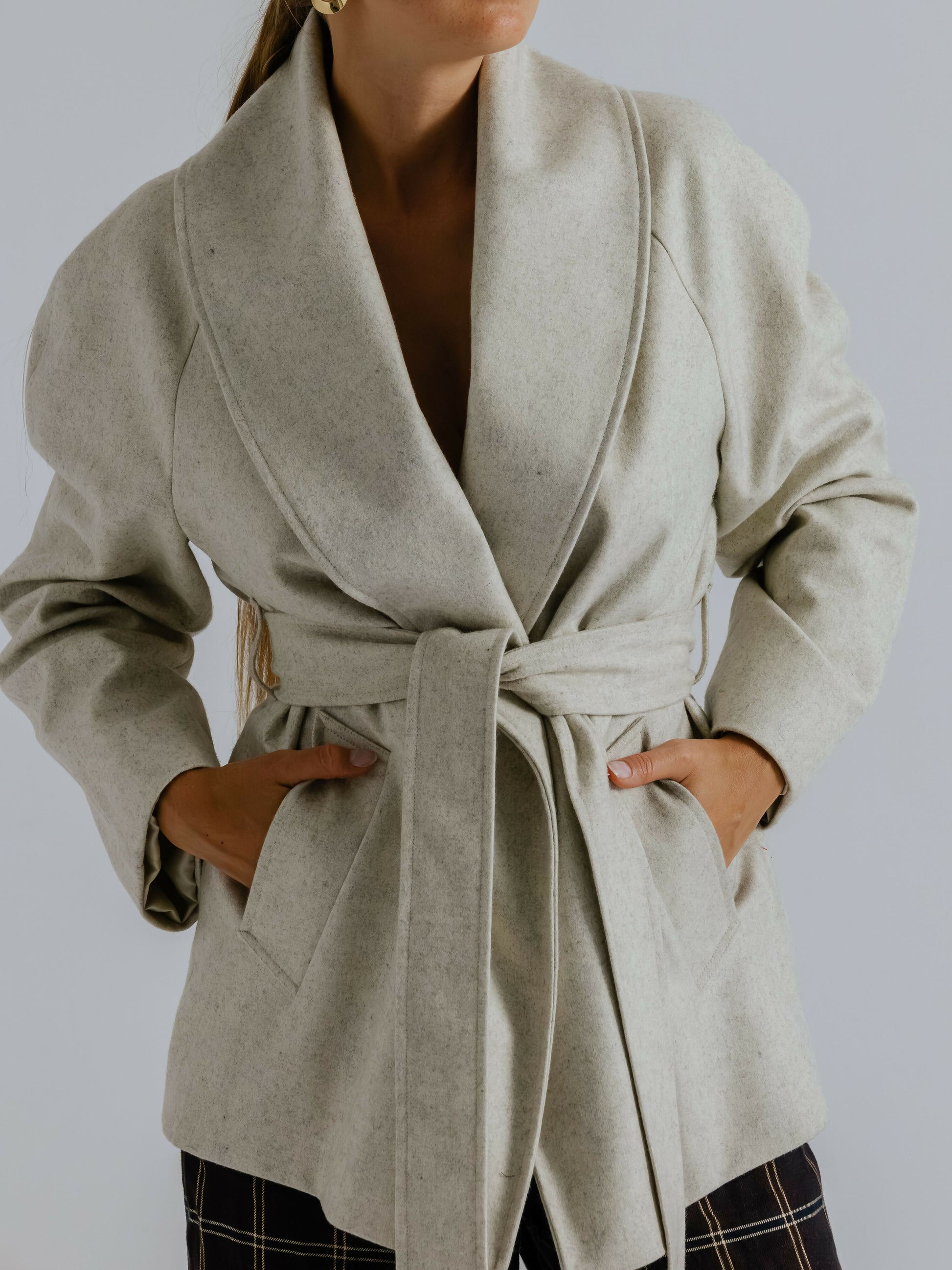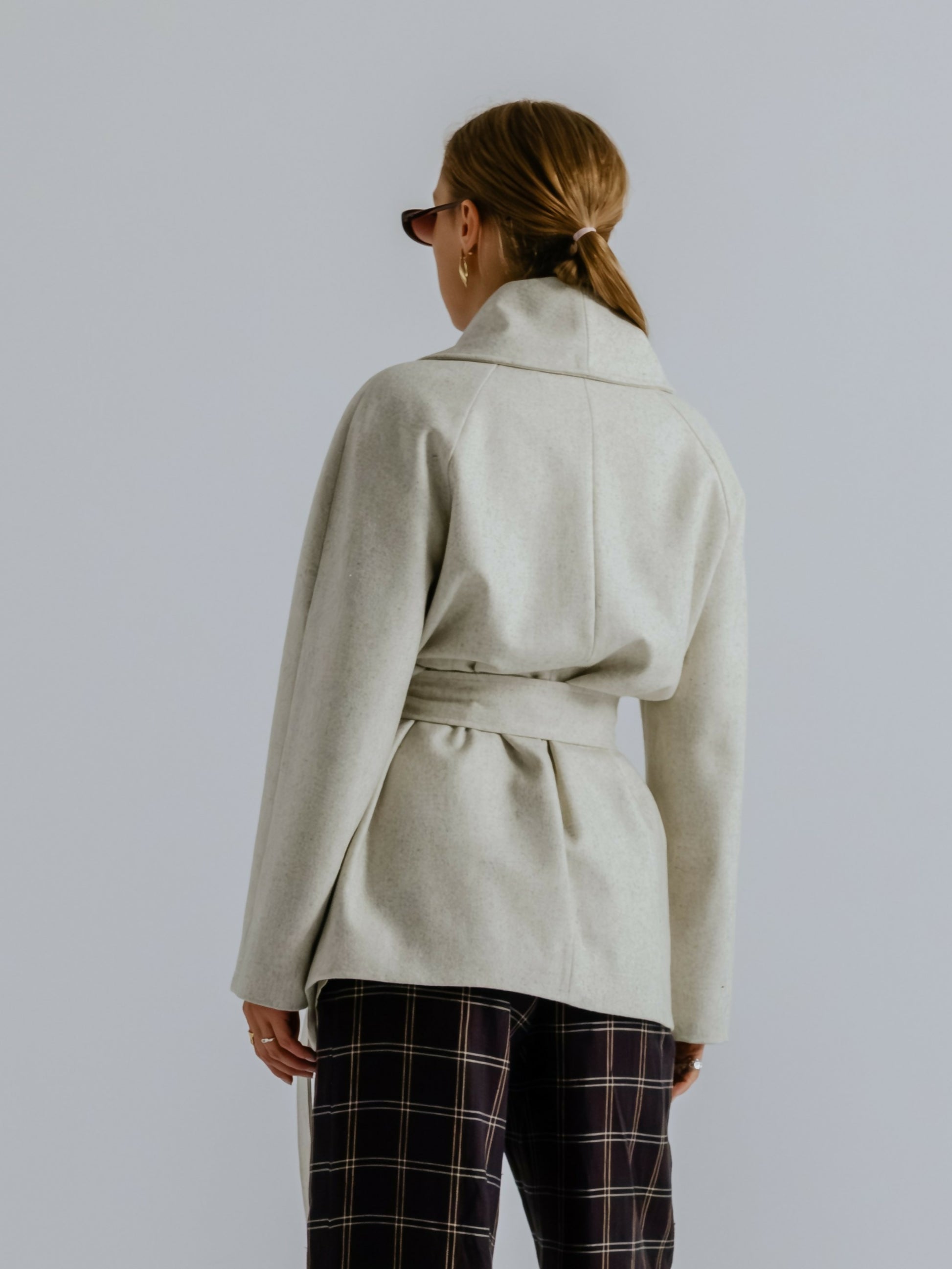 Krótki płaszcz uszyty z mieszanki wełny i wiskozy w odcieniu ecru o lekko oversizowym kroju to kwintesencja klasyki i ponadczasowej elegancji. Reglanowy rękaw naturalnie układa się na ramionach, a szalowy kołnierz dodaje całości szlachetności.