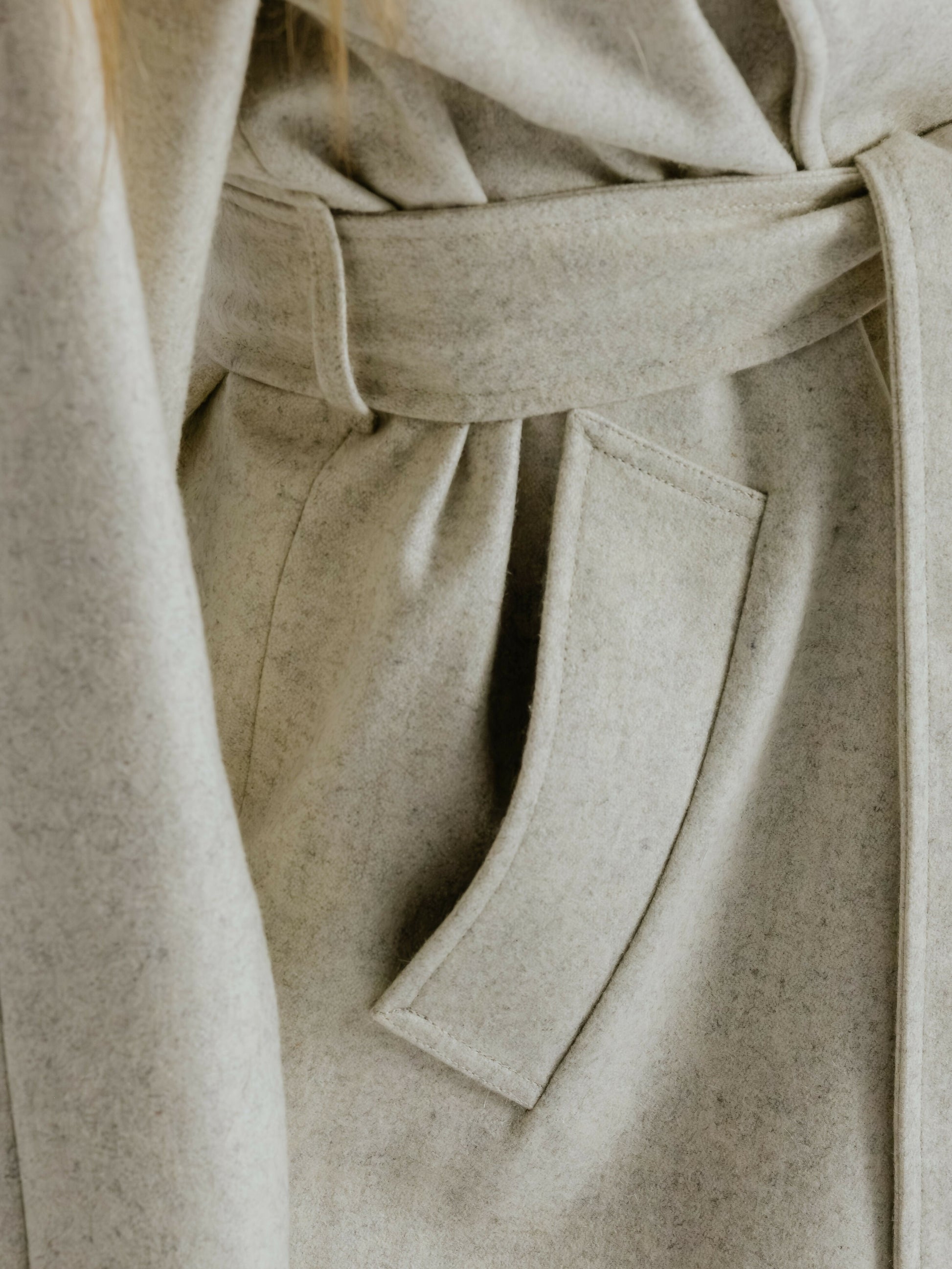 Płaszcz wyposażono w zewnętrzne kieszenie oraz dodatkowe wewnętrzne, ukryte w podszewce — idealne połączenie funkcjonalności i stylu.
