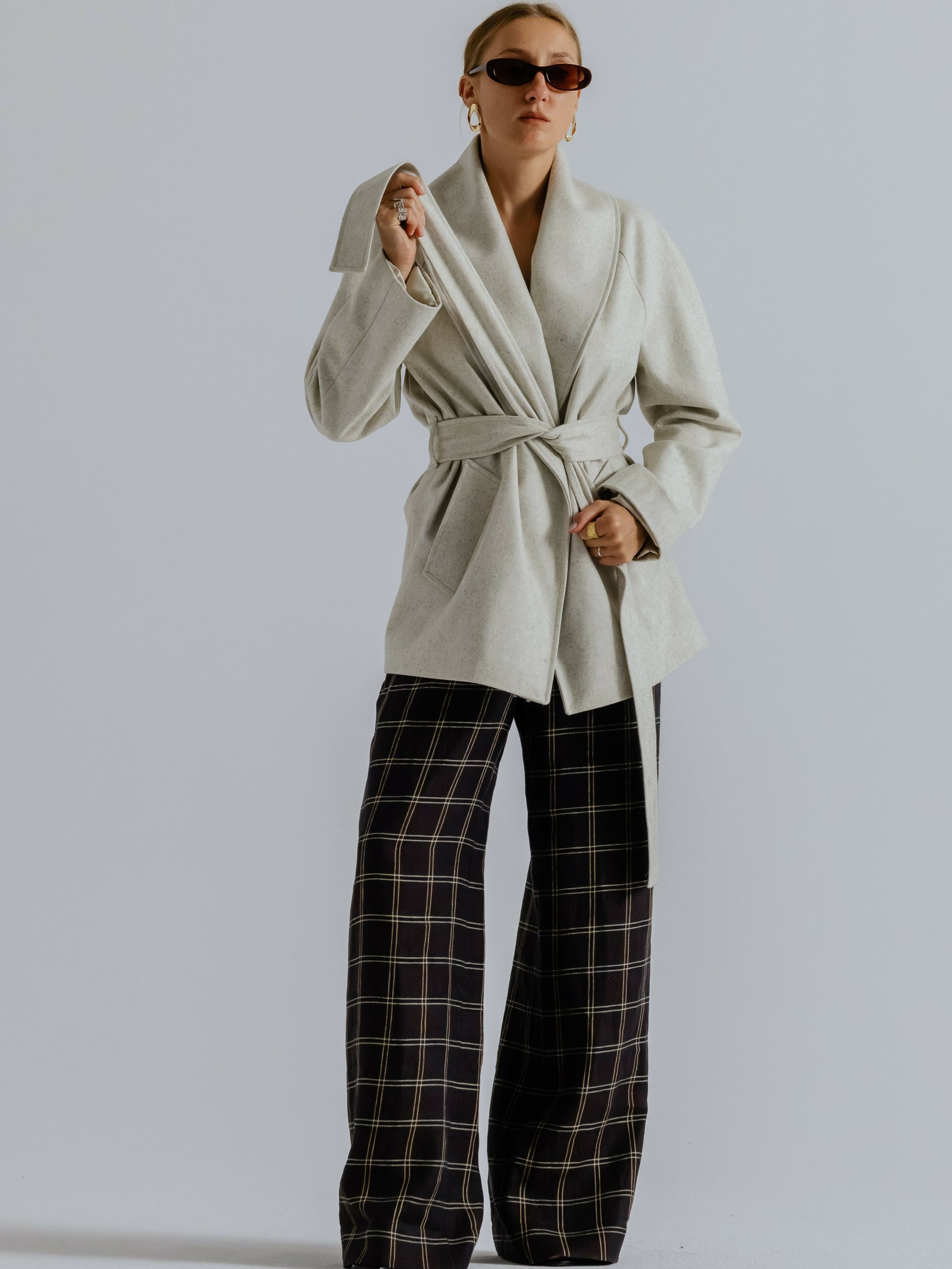 Krótki wełniany płaszcz z kołnierzem szalowym ecru