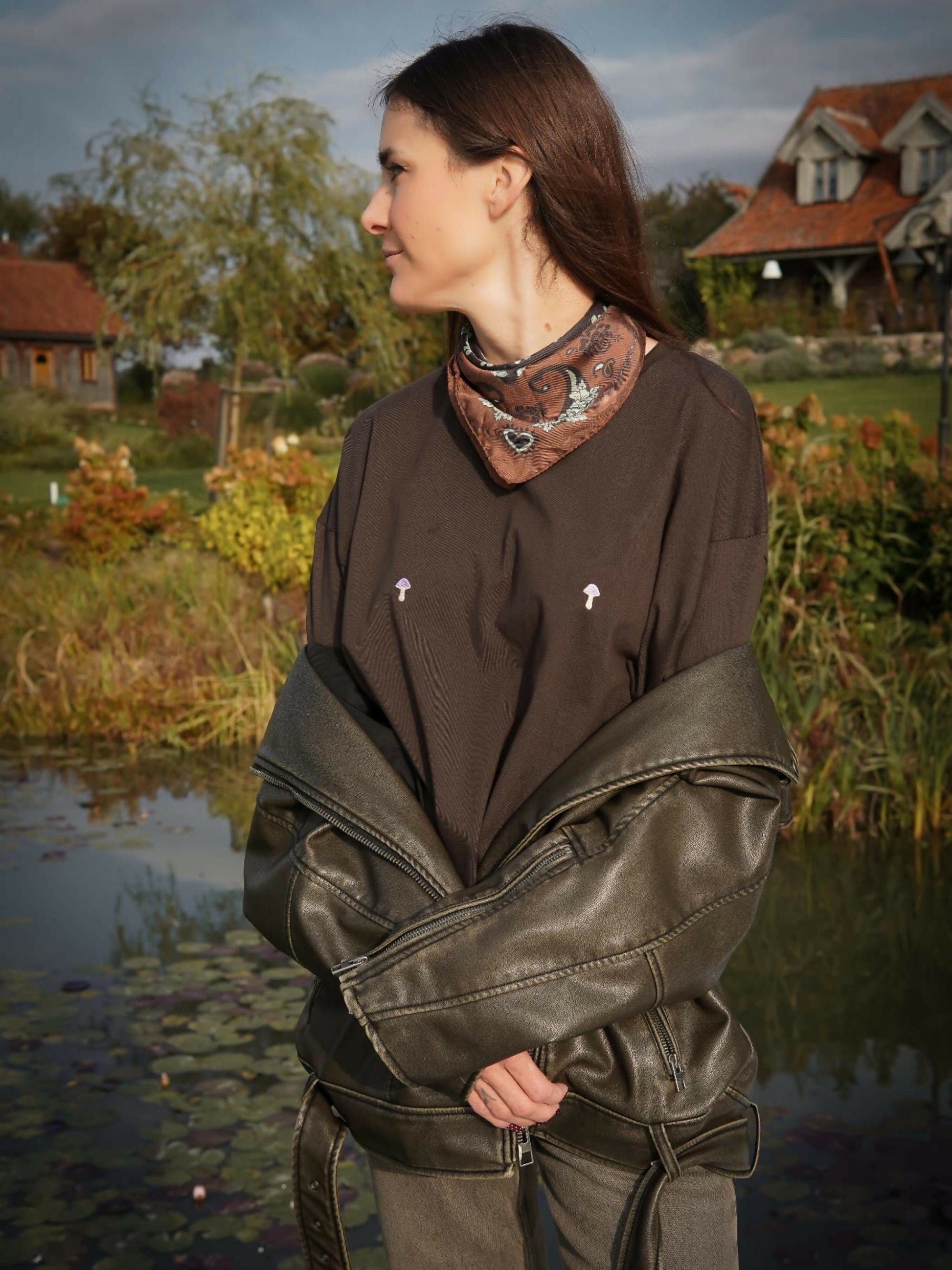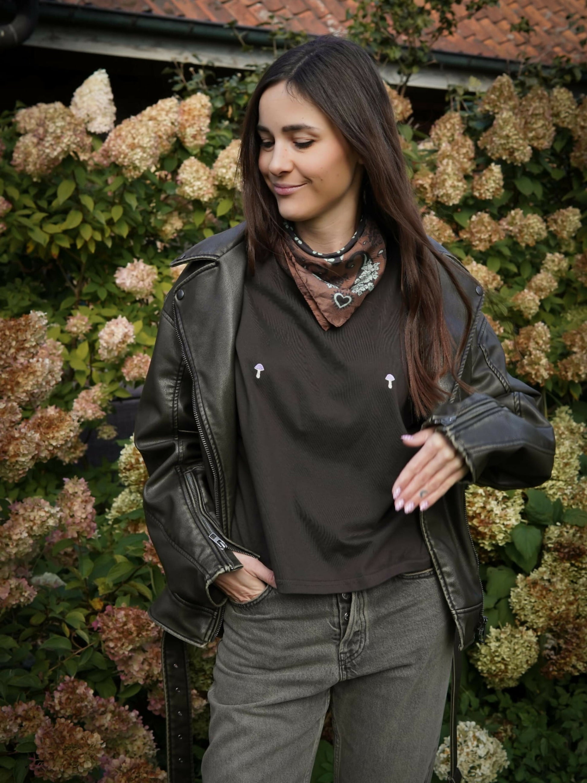 Long-sleeve magiczne grzybki fioletowe - Uniwersalny basic z minimalistycznym haftem wykonany z wysokogatunkowej grubszej dzianiny o gramaturze 210 g/m². 100%-owa oddychająca bawełna sprawi, że nie będziesz chciała nosić niczego innego, a wygodny pudełkowy krój Ci na to pozwoli! Bo bluzka pasuje do wszystkich jesiennych stylizacji. Przyjemnie oversizowa z obniżoną linią ramion i dużym otworem na głowę sprawia, że noszenie jej jest wyjątkowo komfortowe. A lekko skrócony krój dodaje lekkości i świeżości. Do tego piękne minimalistyczne hafty sprawią, że inni miłośnicy grzybków od razu poczują z Tobą więź, jaką zawiązuje się tylko w lesie (albo na imprezie ;) )
