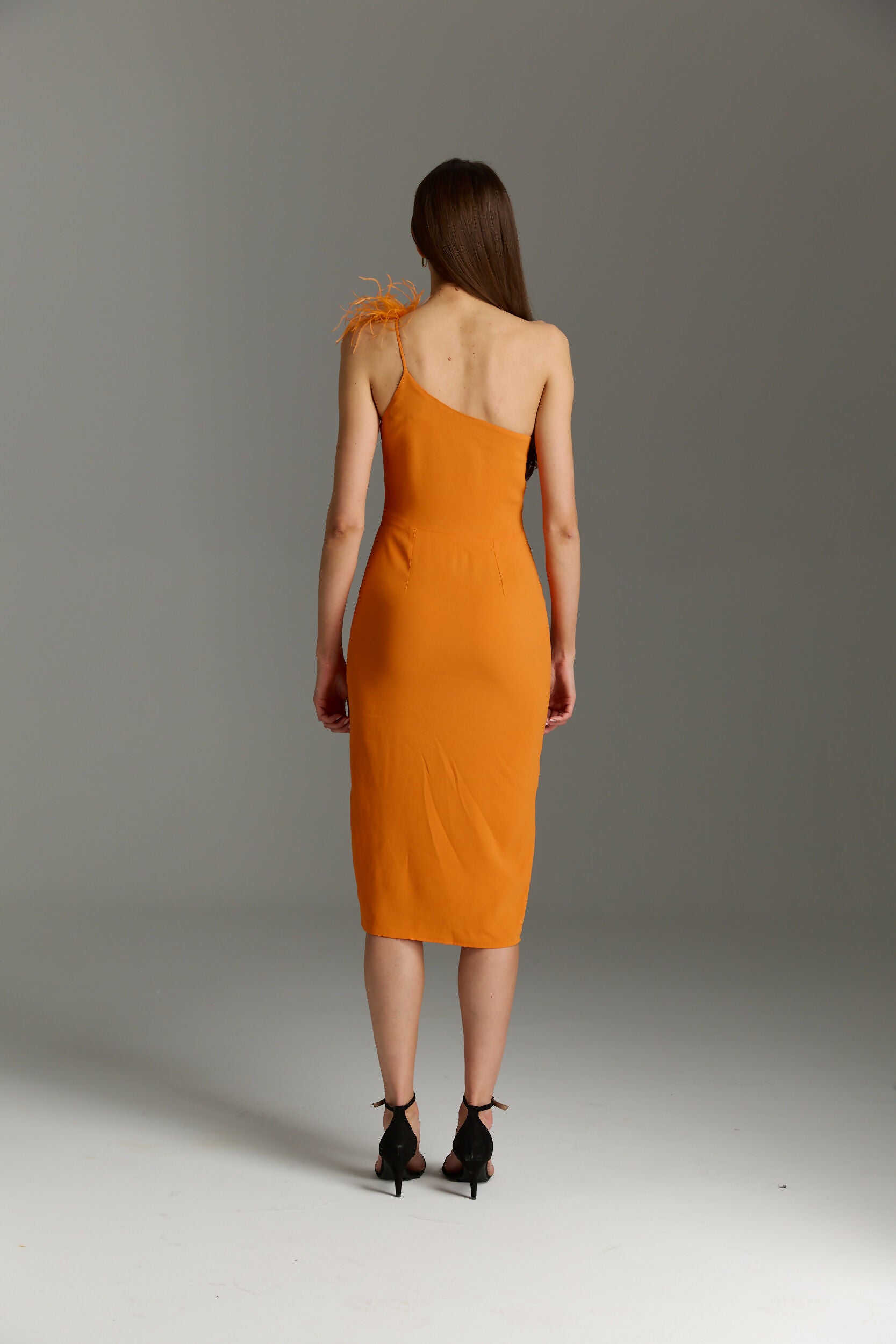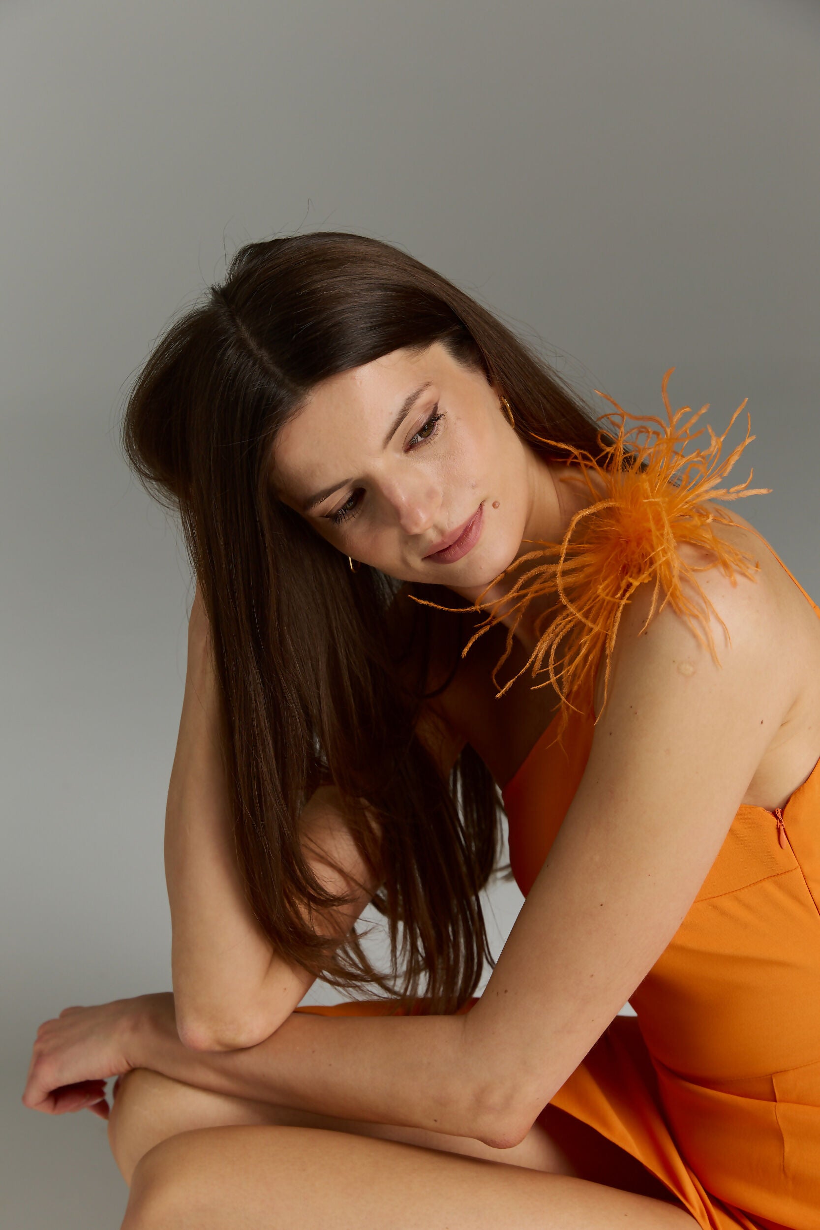 Na ramiączku znajdują się naturalne pióra, które można w każdej chwili odpiąć. W celu umożliwienia prania sukienki w domowych warunkach są one przypinane na ręcznie doszywany zatrzask.