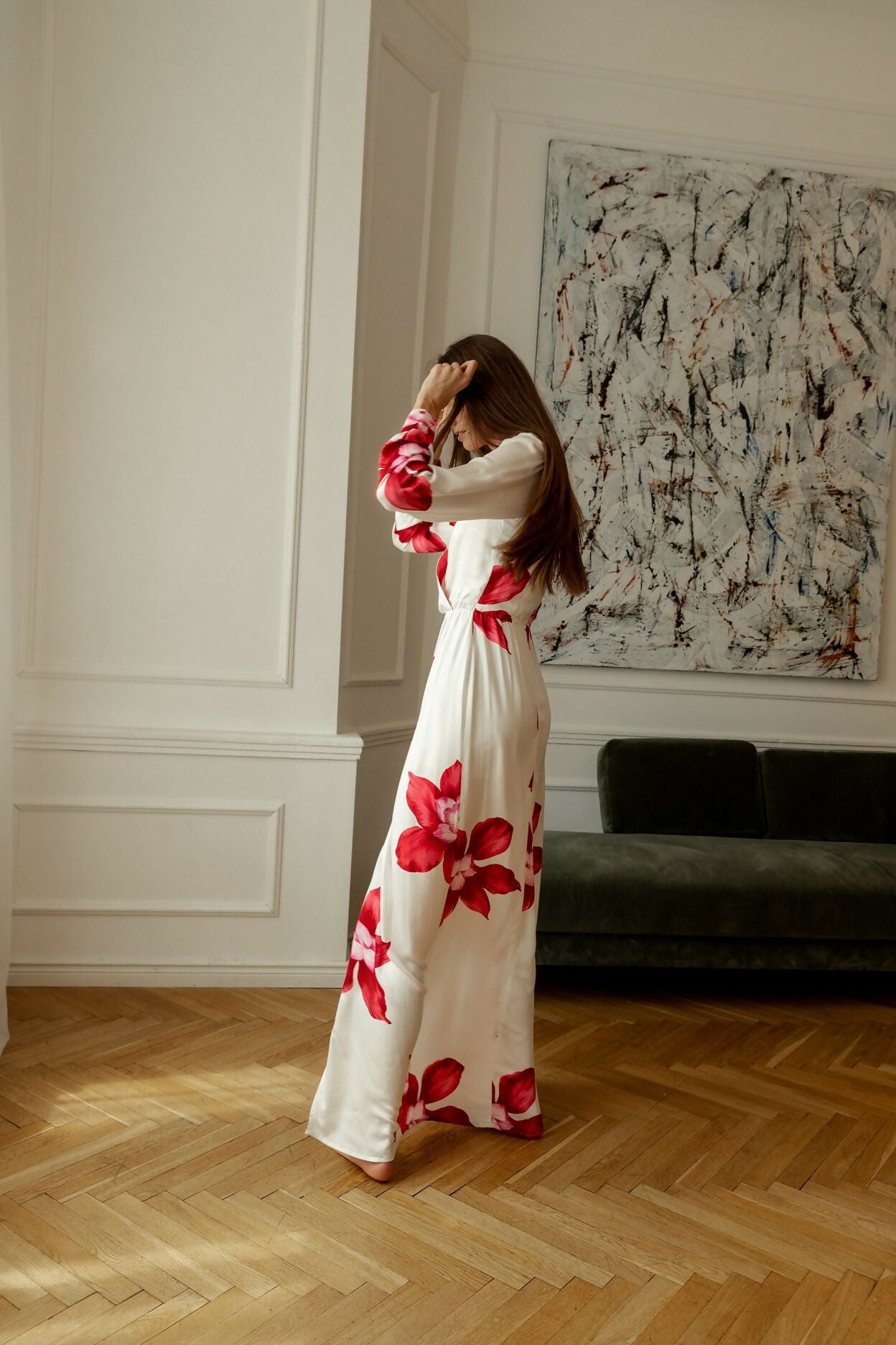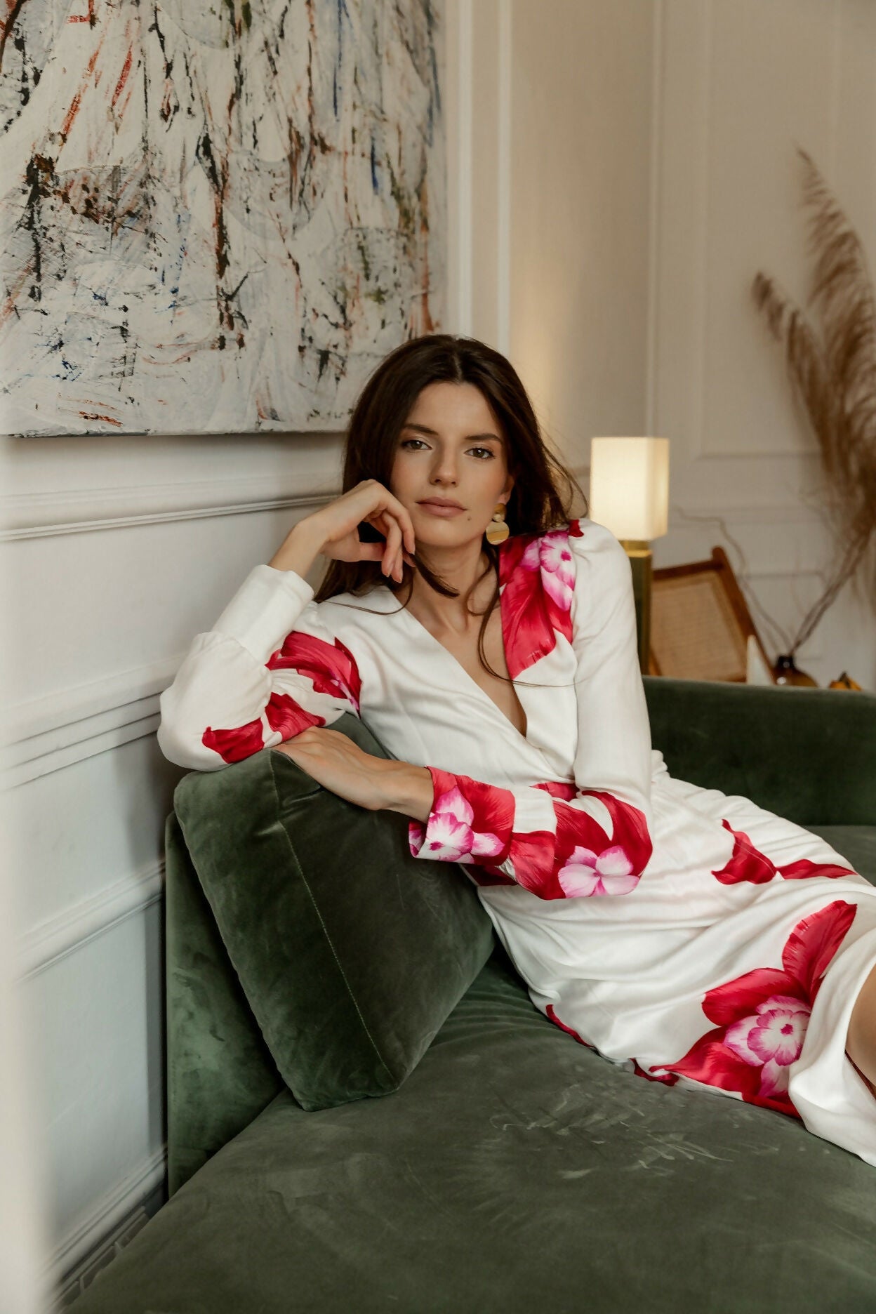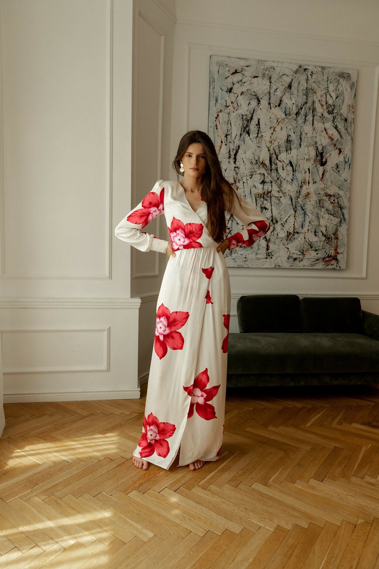 Lubisz zwiewne, kobiece i subtelne sukienki? To tak jak my! Sukienka w kwiaty wykonana jest z lekkiej, bardzo przyjemnej w dotyku wiskozy, która wspaniale „płynie” w ruchu. Wzór kwiatowy dodaje jej wspomnianej subtelności i podkreśla urodę właścicielki sukienki. Delikatnego pazura dodaje jej widoczny dekolt, zaznaczona gumką talia i rozporek, który świetnie eksponuje nogi.
