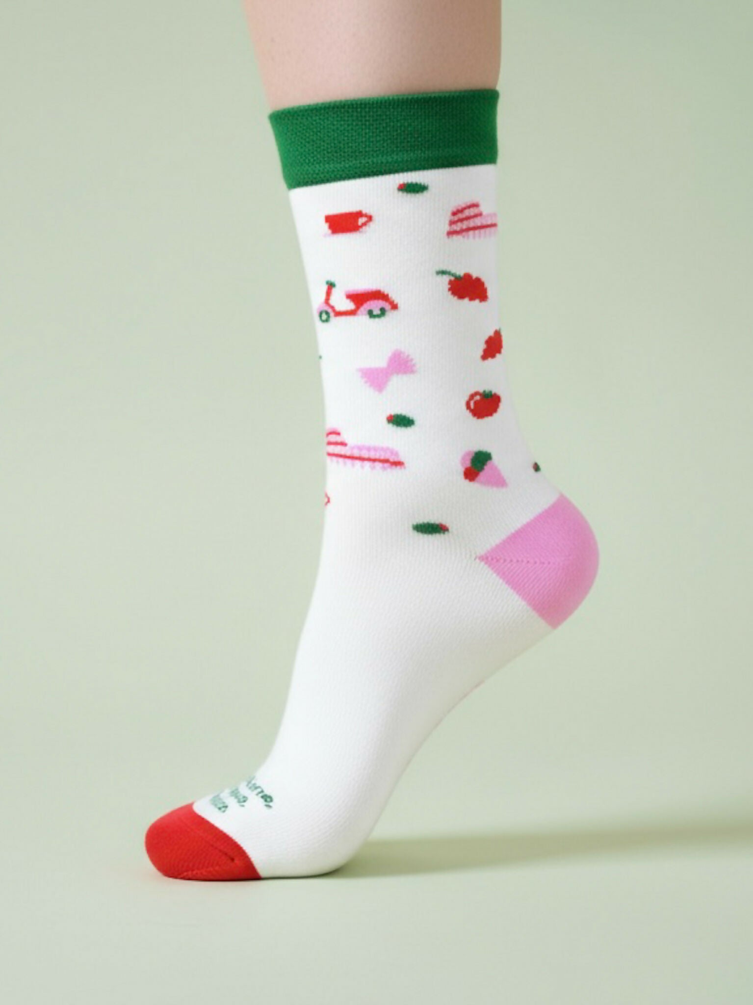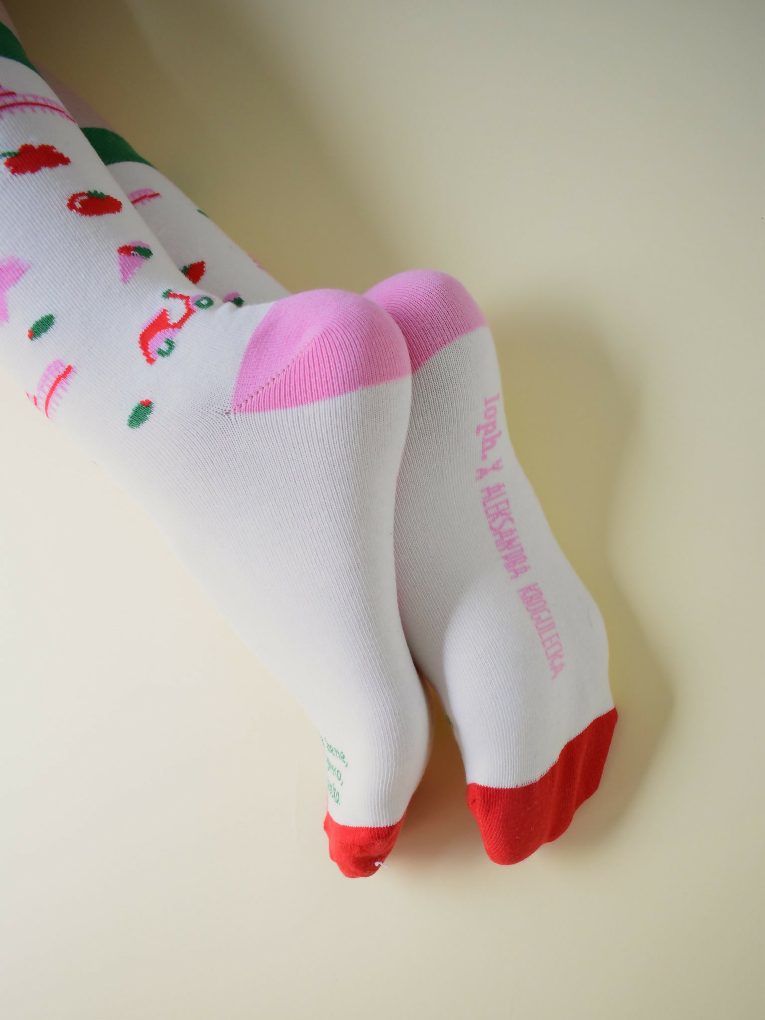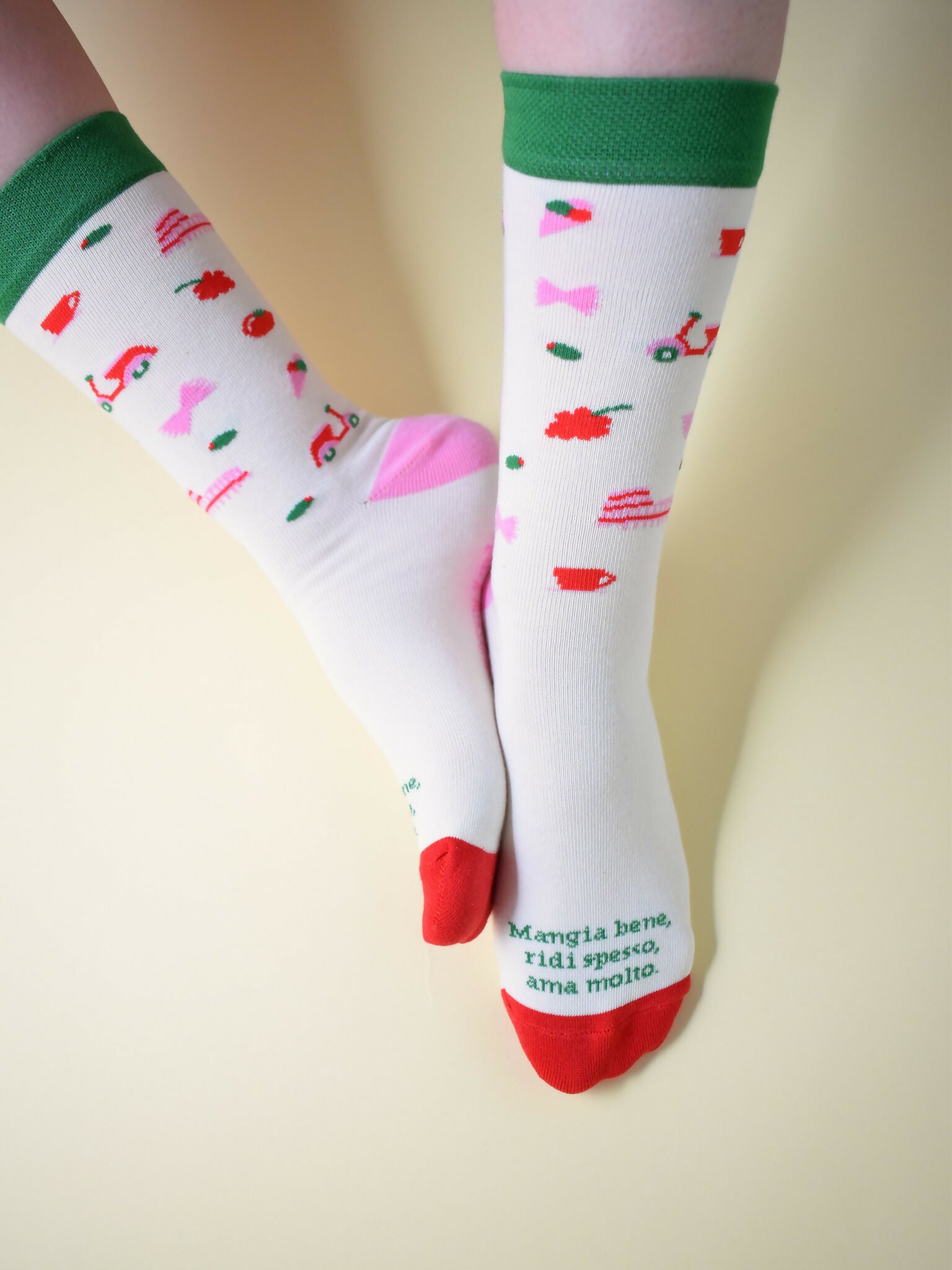 Włoski styl, wygoda i odrobina radości w każdym kroku! Te kolorowe skarpetki z napisem „Mangia bene, ridi spesso, ama molto” („Jedz dobrze, śmiej się często, kochaj mocno”) to połączenie wysokiej jakości wykonania z pozytywnym przesłaniem. Skarpety z kolekcji HELLO FROM VACATION - włoskie. Powstały we współpracy z malarką Aleksandrą Krogulecką. Każda para skarpet z tej kolekcji opowiada swoją historię, przeplecioną pozytywnym mottem związanym z danym krajem. Ten wzór to połączenie stylu, komfortu i pasji do włoskiej kultury. Skarpety z motywami włoskimi, przeniosą Was wprost do słonecznej Italii!