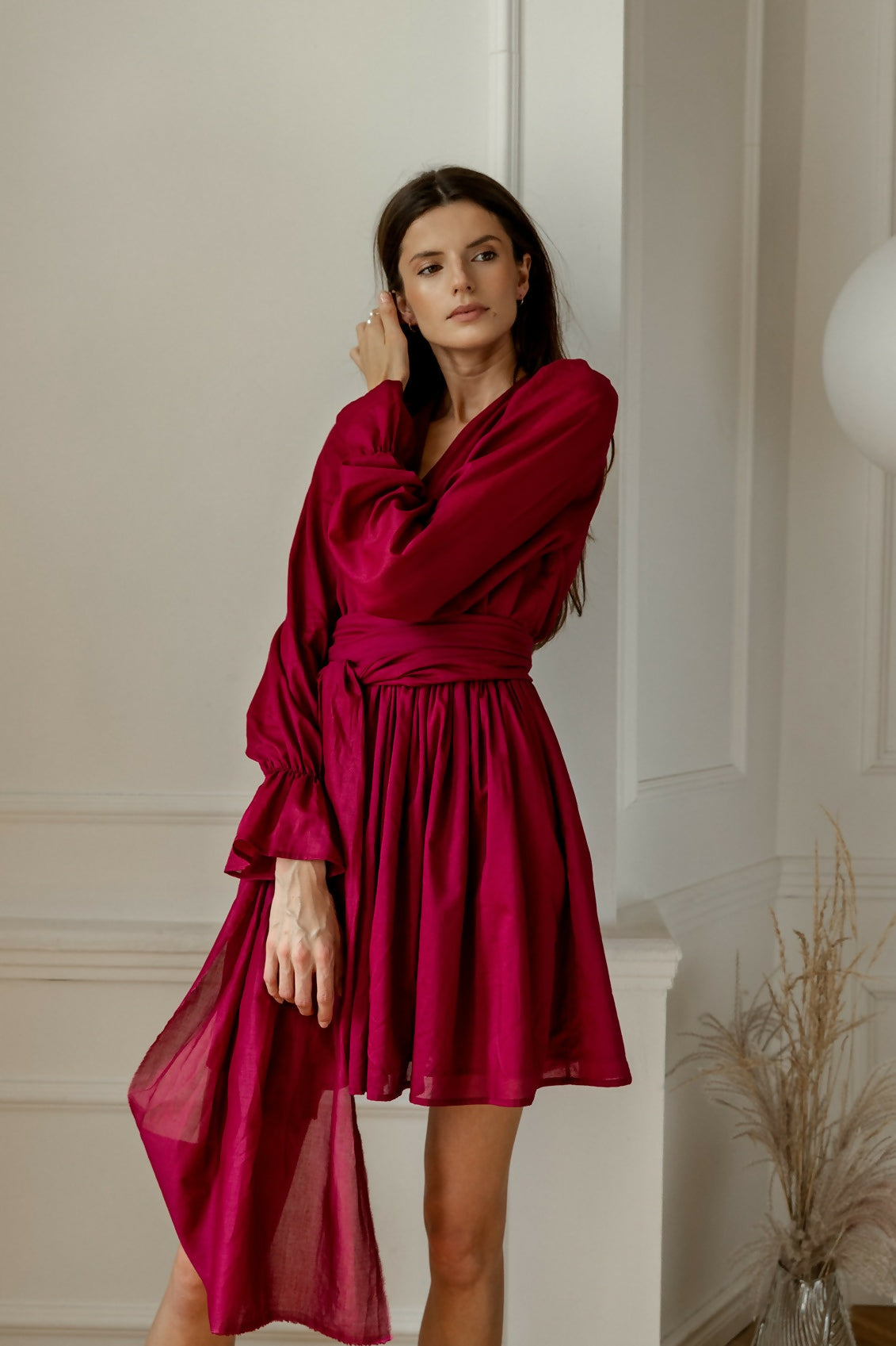 3 słowa, która najlepiej opiszą sukienkę z bawełny? Marszczenia, bufiaste rękawy, transparentność. Wykonana jest z przyjemnej w dotyku bawełny, a więc sprawdzi się w każdej temperaturze. O komfort noszenia zadbaliśmy też poprzez dodanie gumki w talii i paska, który możesz wiązać na wiele sposób zgodnie z własnymi upodobaniami. Sukienka ma delikatnie bufiaste i transparentne rękawy, które zebrane w nadgarstku gumką dają piękny efekt tulipana na ich zakończeniu. Bogate marszczenie spódnicy sprawia, że sukienka zda egzamin w bardziej eleganckich sytuacjach.