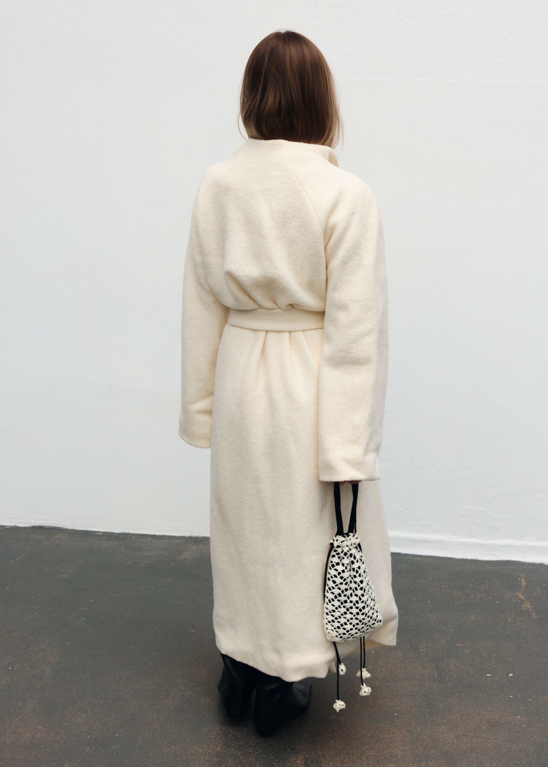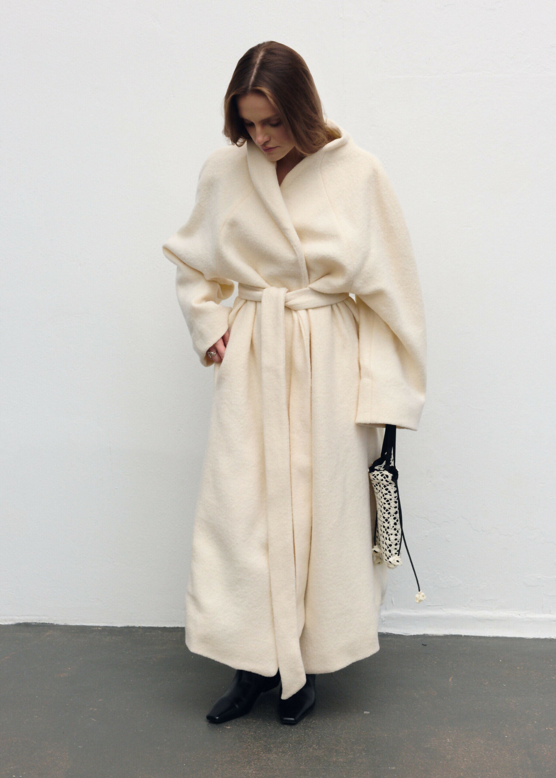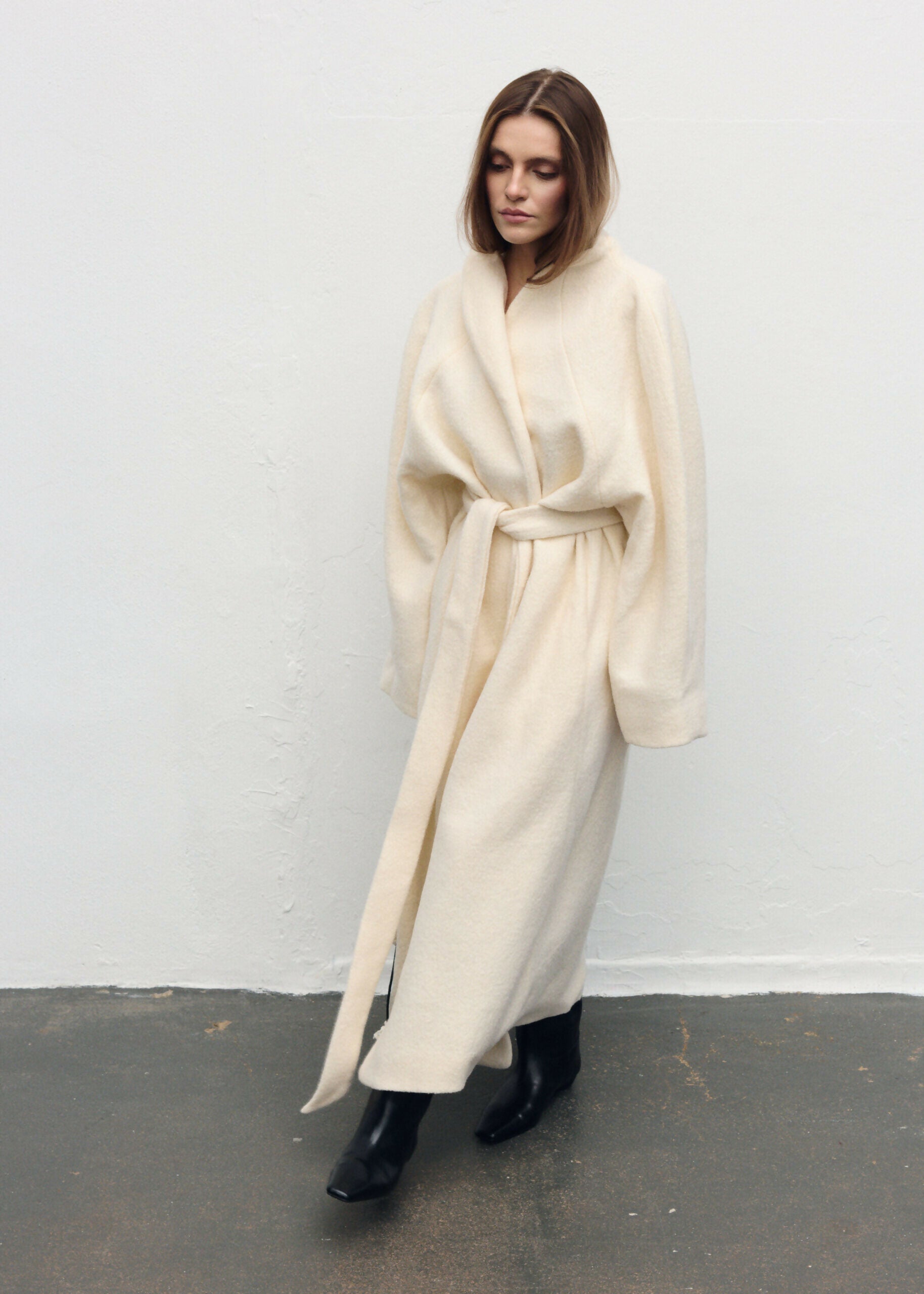 Płaszcz Ava został zaprojektowany z myślą o czystej, nieprzerwanej linii – bez szlufek, które mogłyby zaburzyć jego minimalistyczną formę. Brak zapięcia podkreśla lekkość konstrukcji, a długi pasek pozwala dowolnie modelować sylwetkę – od swobodnej po bardziej dopasowaną. Przeskalowany krój i rękaw reglanowy nadają projektowi nowoczesny charakter.