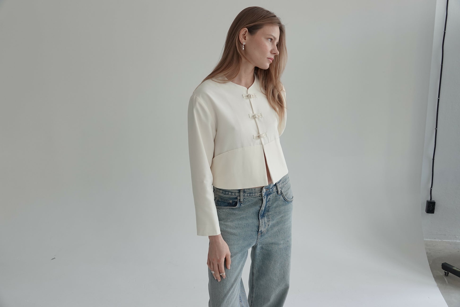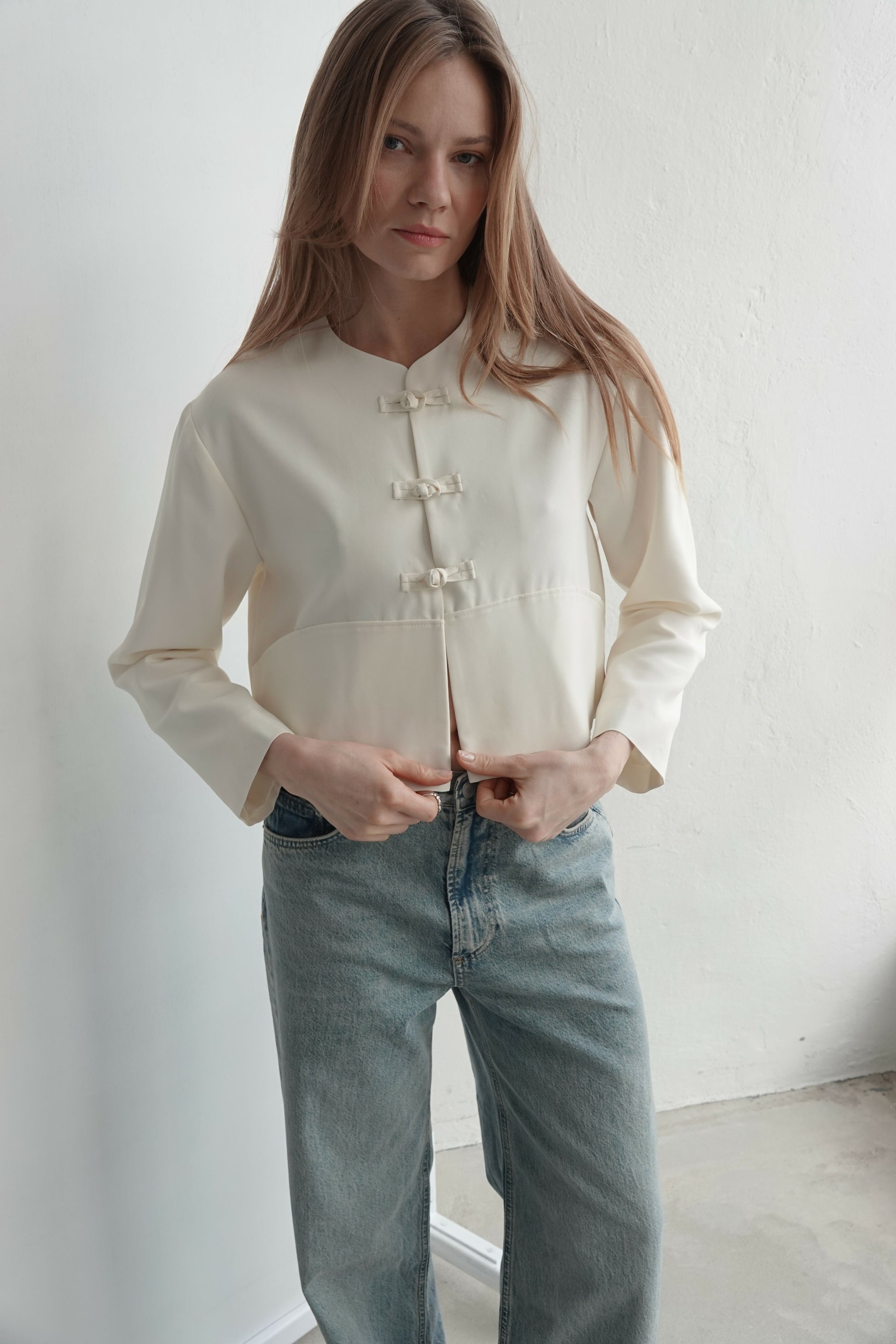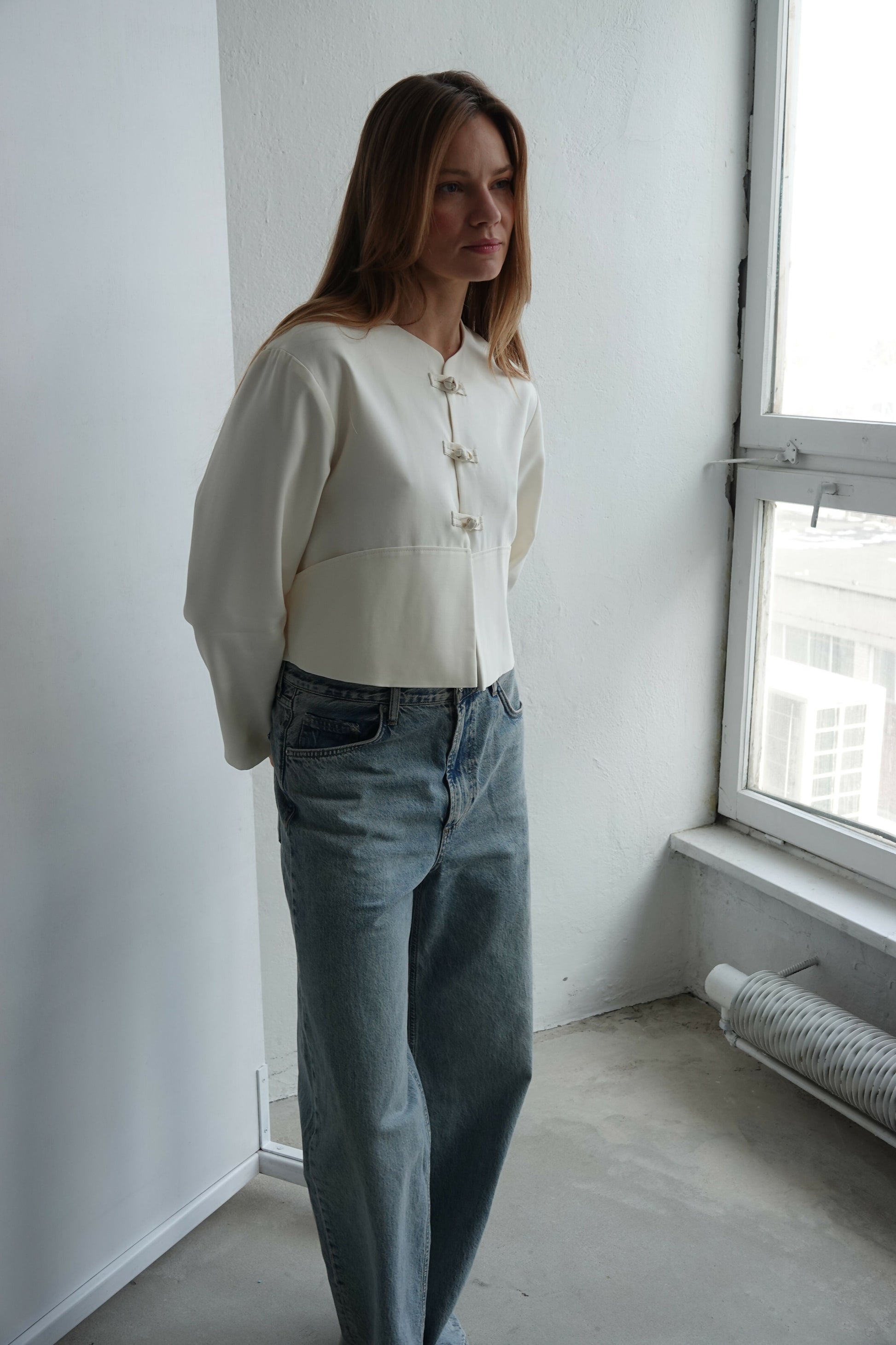 Minimalistyczna, a jednocześnie wyrazista kurtka o krótkim, pudełkowym kroju w eleganckim kremowym odcieniu. Model wyróżnia się subtelnymi, dekoracyjnymi zapięciami inspirowanymi klasycznymi haftkami, które nadają całości unikatowego, dopracowanego charakteru. Gładka, strukturalna tkanina pięknie trzyma formę, a prosty fason sprawia, że kurtka doskonale uzupełni zarówno codzienne stylizacje z jeansami, jak i bardziej eleganckie zestawy.