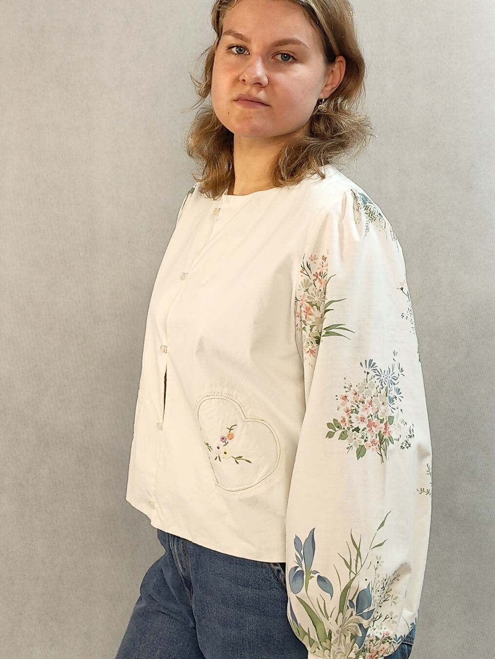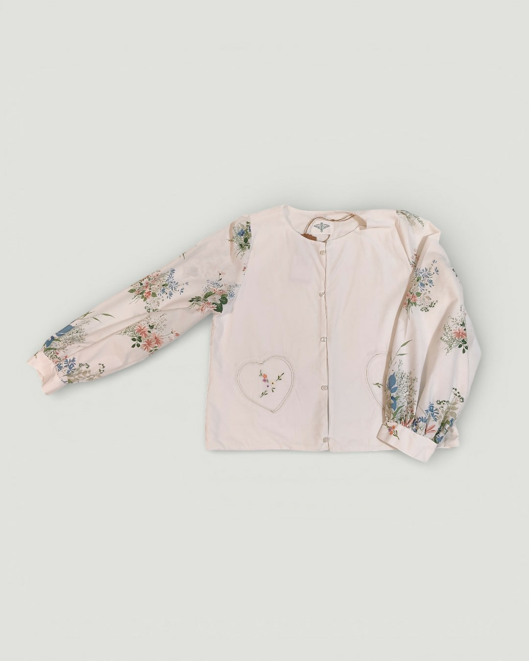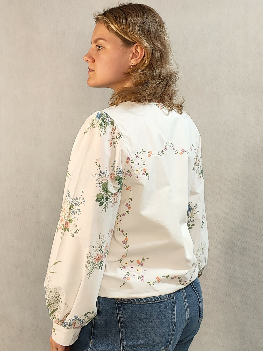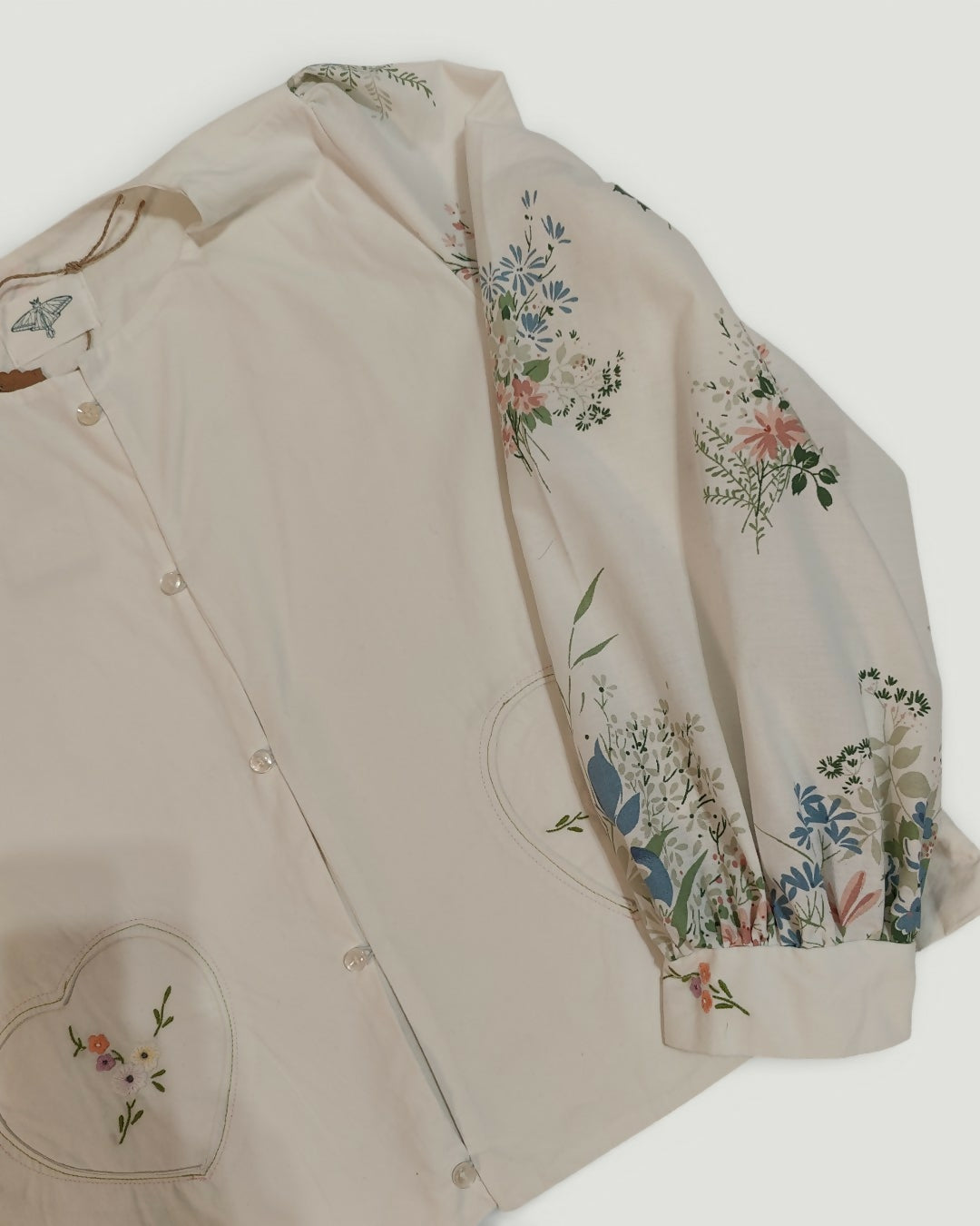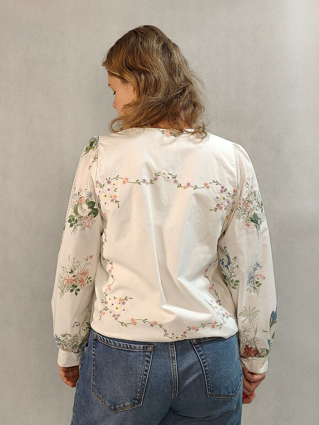 Zapinana koszula z haftem z przodu i na plecach, kwiatowe rękawy